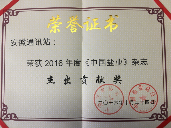 安徽鹽業(yè)通訊站榮獲《中國鹽業(yè)》雜志2016年度先進通訊站杰出貢獻獎